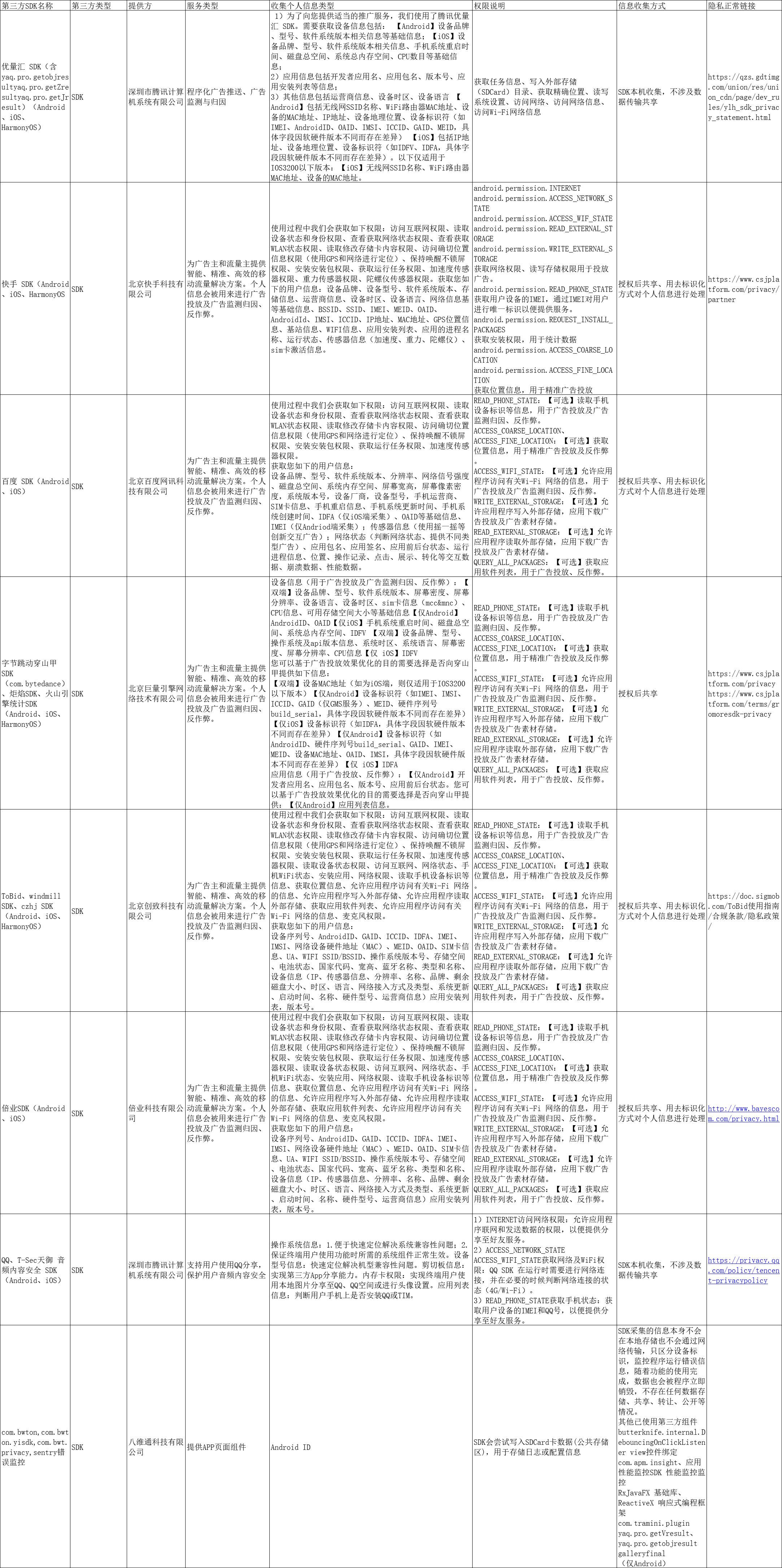 我们会对SDK的接入和使用进行符合互联网行业通常能力的审核,以保障您的个人信息安全。同时也请您理解,即便我们尽可能地及时更新此清单,但在一定情况下仍可能会滞后于APP实际使用的情况;如果新增SDK需获取您的重要隐私信息或设备权限时,我们会通过合理方式取得您的授权同意。下表所列信息,具体请以各SDK公示的官方说明为准。